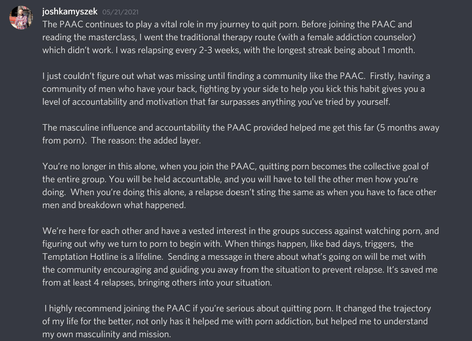 You will be guided through every battle of quitting porn, but only if you let other PAAC members know you need them.